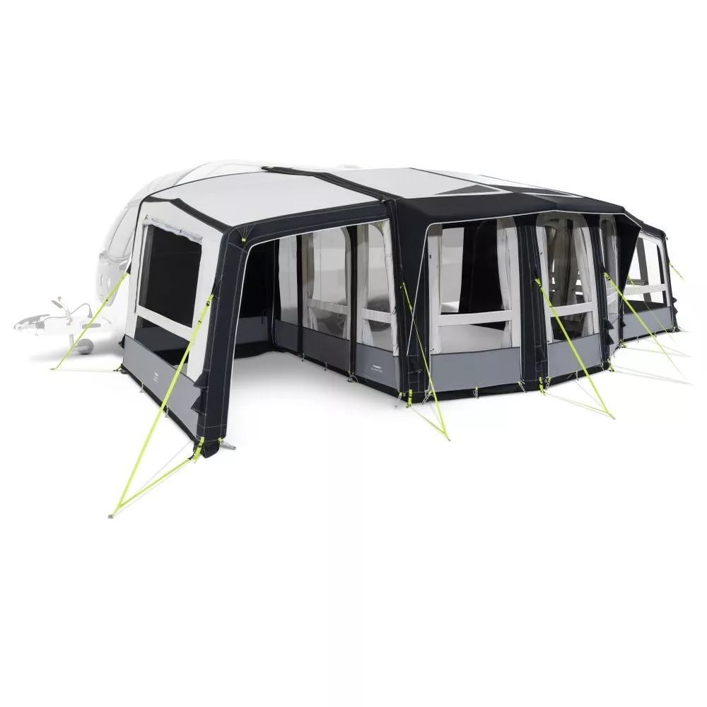 Das Vorzelt selbst kann getrennt bleiben oder du nimmst die seitliche Wand ab, so dass du einen einzigen grossen Wohnbereich erhältst. Die Erweiterung wird wie das Vorzelts selbst über nur ein Ventil aufgeblasen, daher folglich genauso leicht aufzubauen.