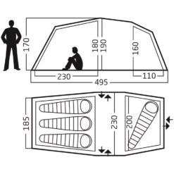 Du wirst dich wundern, wie viel Platz das Ashwood bietet, da die steilen Seitenwände den Platz im Zeltinneren optimieren. Die Innenhöhe von 190 cm im Wohnbereich bietet genug Kopffreiheit, um aufrecht zu stehen. Im knapp 5 Quadratmeter grossen Vorraum findet die Campingausrüstung, eine Campingsitzgruppe oder ein Zeltschrank Platz. Die grossen Fenster lassen viel Tageslicht nach innen, lassen sich aber wahlweise durch die vorhandenen Vorhänge verhüllen. Die Front kann komplett geöffnet werden und ist neben Doppelreissverschluss und Moskitonetz jetzt auch mit dem innovativen Quick and Quiet-System ausgestattet. Dieses erlaubt dir dank Magnetmechanismus ein beinahe lautloses Betreten. Das Quick and Quiet-Sytem findet sich übrigens ebenfalls in der Schlafkabinentür wieder. Wer das nicht möchte, kann die Türen aber natürlich auch weiterhin mit dem konventionellen Reissverschluss öffnen und schließen. Mit dem praktischen Vordach hast du immer ein schattiges Plätzchen, sowie Schutz vor Regen.