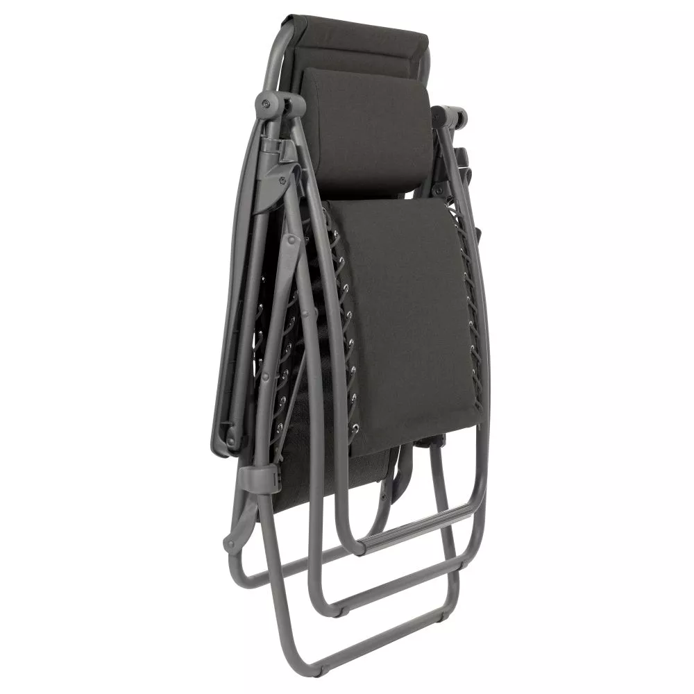 Hervorragenden Komfort liefert die gepolsterte, 3 cm dicke Sitzfläche mit einer Füllung aus hochverdichtetem Schaumstoff. Armlehnen aus Harz mit Schaumstoffeinlage bieten zusätzliche Bequemlichkeit in der gewünschten, stufenlos einstellbaren Sitz- oder Liegeposition. Die Einstellung „Schwerelosigkeit“ (mit den Füssen leicht oberhalb des Herzens) schenkt eine ausgezeichnete Entspannungsposition. Fixiert wird die gewählte Position einfach und sicher mit einer Feststellbremse. Das Gerüst des Camping-Relaxstuhl RSX von Lafuma bildet ein solides HLE-Stahlrohrgestell mit hoher Elastizitätsgrenze. Der attraktive Bezug aus einem angenehmen Baumwollmischgewebe ist abnehmbar und mit einer Aufhängung an austauschbaren Gummischnüren für beste Federung ausgestattet. Ein verstellbares und abnehmbares Nackenkissen unterstützt die rückenfreundliche Ausführung des Relaxsessels.