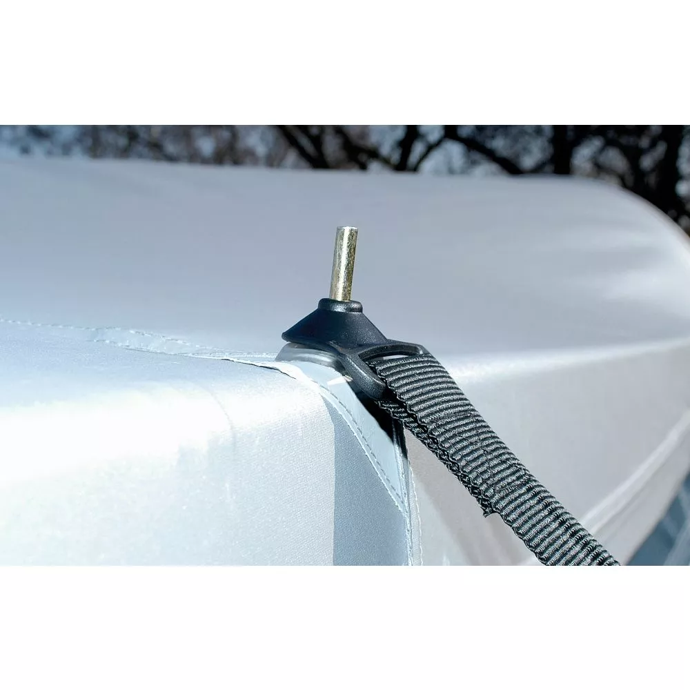 Herkömmliche, über dem Vorzelt liegende Sturmgurte können durch Scheuern das Dachgewebe beschädigen. Fest angenähte Sturmsicherungen können die Naht- und Gewebebereiche unnötig belasten. Das Sturmsicherungspaket Mistral von brand hingegen sichert das Vorzelt am Gestängedorn der Eckwinkel, einem der stabilsten Punkte eines Vorzeltes. Die Abspannung erfolgt mit stabilen Gewebegurten und robusten Ankerheringen. Eine dazwischen gesetzte Stahl-Spiralfeder gleicht durch Windböen hervorgerufene Reiss- und Zugkräfte aus.