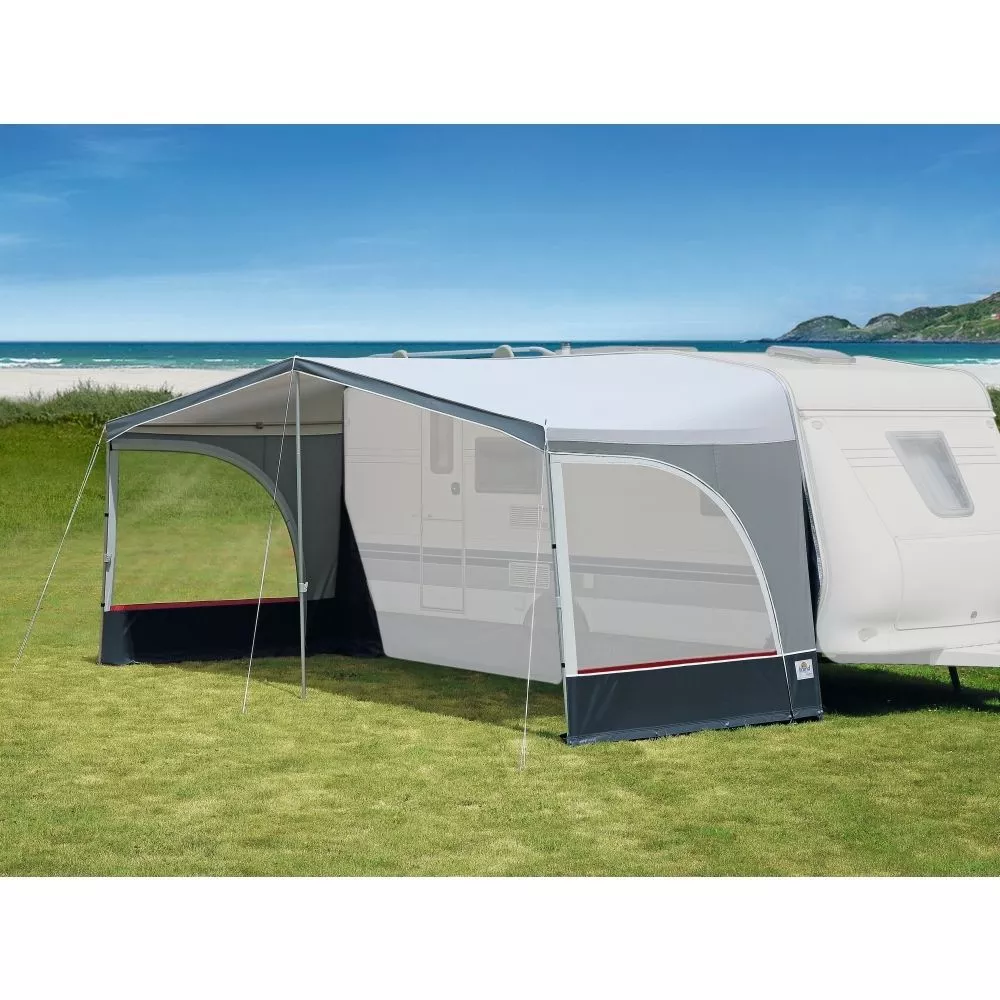 Das Wohnwagen-Sonnendach brand Sunny SD ist ein komfortables, ca. 235 cm tiefes Qualitäts-Sonnendach, das inklusive Seitenwänden geliefert wird. Diese Seitenwandelelemente sind durch Reissverschlüsse einfach zu entnehmen. Das Sunny SD überzeugt durch einen einfachen Aufbau des Vorzeltgerüsts mit drei Standbeinen und drei Dachstangen. Das leichte Aluminiumgestänge wird besonders von Reisecampern geschätzt. Das spezielle Sonnendach-Gewebe garantiert ein minimales Gewicht.